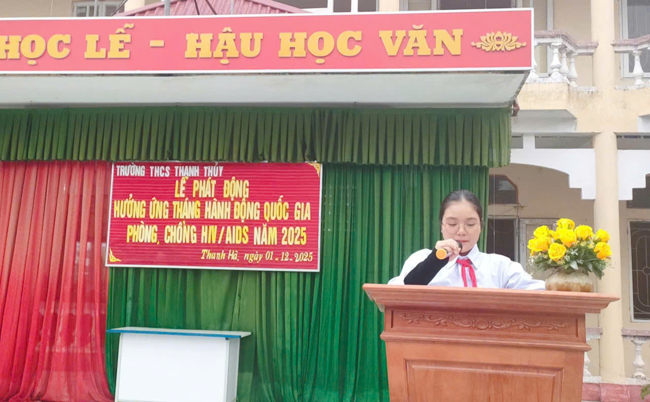 Hưởng ứng “Tháng hành động Quốc gia phòng, chống HIV/AIDS năm 2025” với chủ đề “Đoàn kết là sức mạnh – Chung tay chấm dứt dịch bệnh AIDS”, sáng ngày 01/12/2025, Trường THCS Thanh Thủy đã tổ chức Lễ phát động hưởng ứng Tháng hành động Quốc gia phòng, chống HIV/AIDS năm 2025. Đây là hoạt động có ý nghĩa thiết thực nhằm trang bị kiến thức, nâng cao nhận thức và trách nhiệm của học sinh trong việc phòng tránh, ngăn ngừa căn bệnh nguy hiểm này.