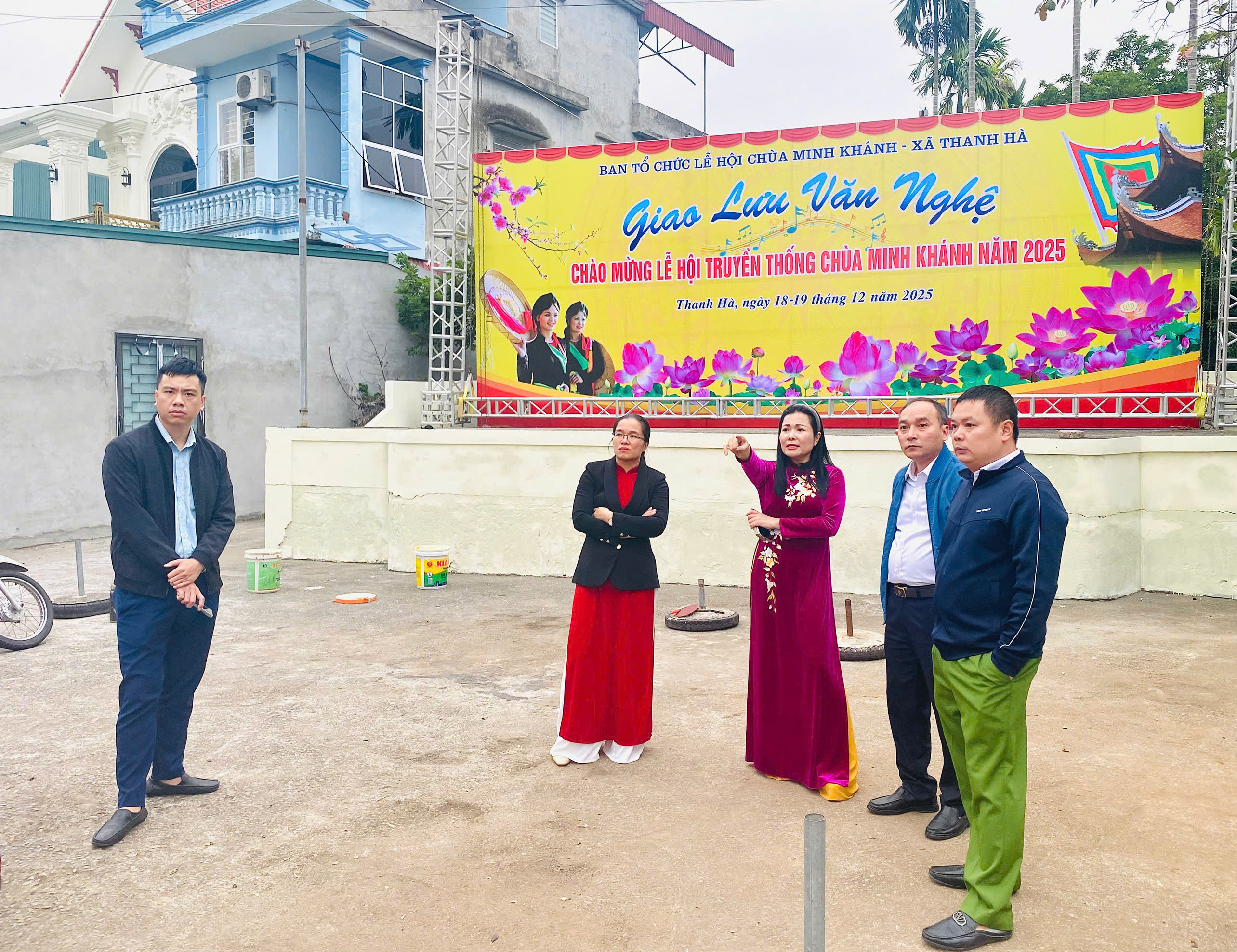 Đồng chí Phạm Thị Thanh Tâm, Uỷ viên Thành uỷ, Bí thư Đảng uỷ, Chủ tịch HĐND xã cùng các đồng chí lãnh đạo xã kiểm tra công tác chuẩn bị lễ hội