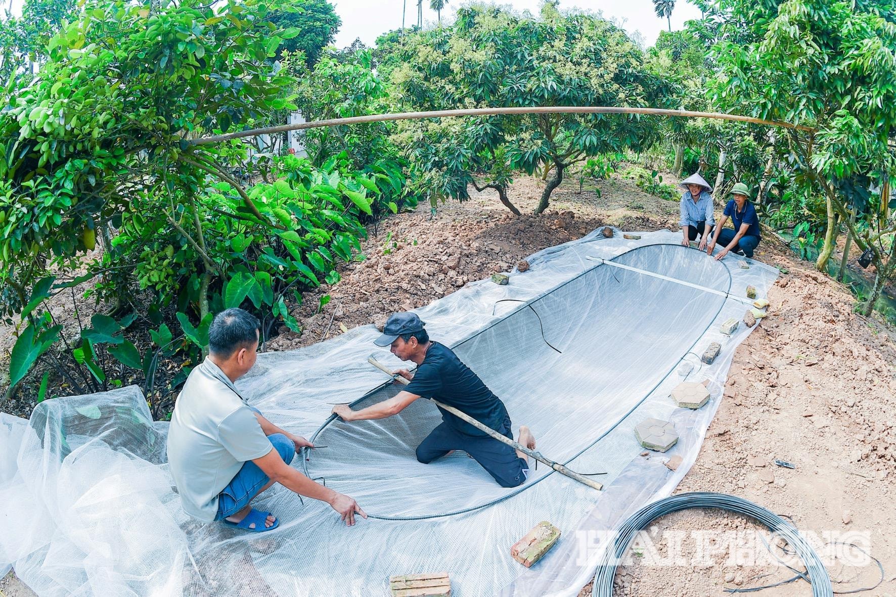 Nông dân làm thuyền để chuẩn bị cho vụ vải mới tại khu sinh thái Đồng Mẩn, xã Thanh Hà. Ảnh: THÀNH CHUNG