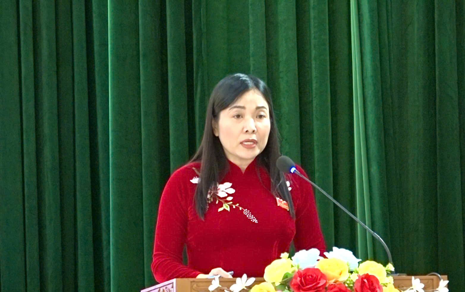 Đồng chí Phạm Thị Thanh Tâm, Uỷ viên Thành uỷ, Bí thư Đảng uỷ, Chủ tịch HĐND xã phát biểu tại kỳ họp