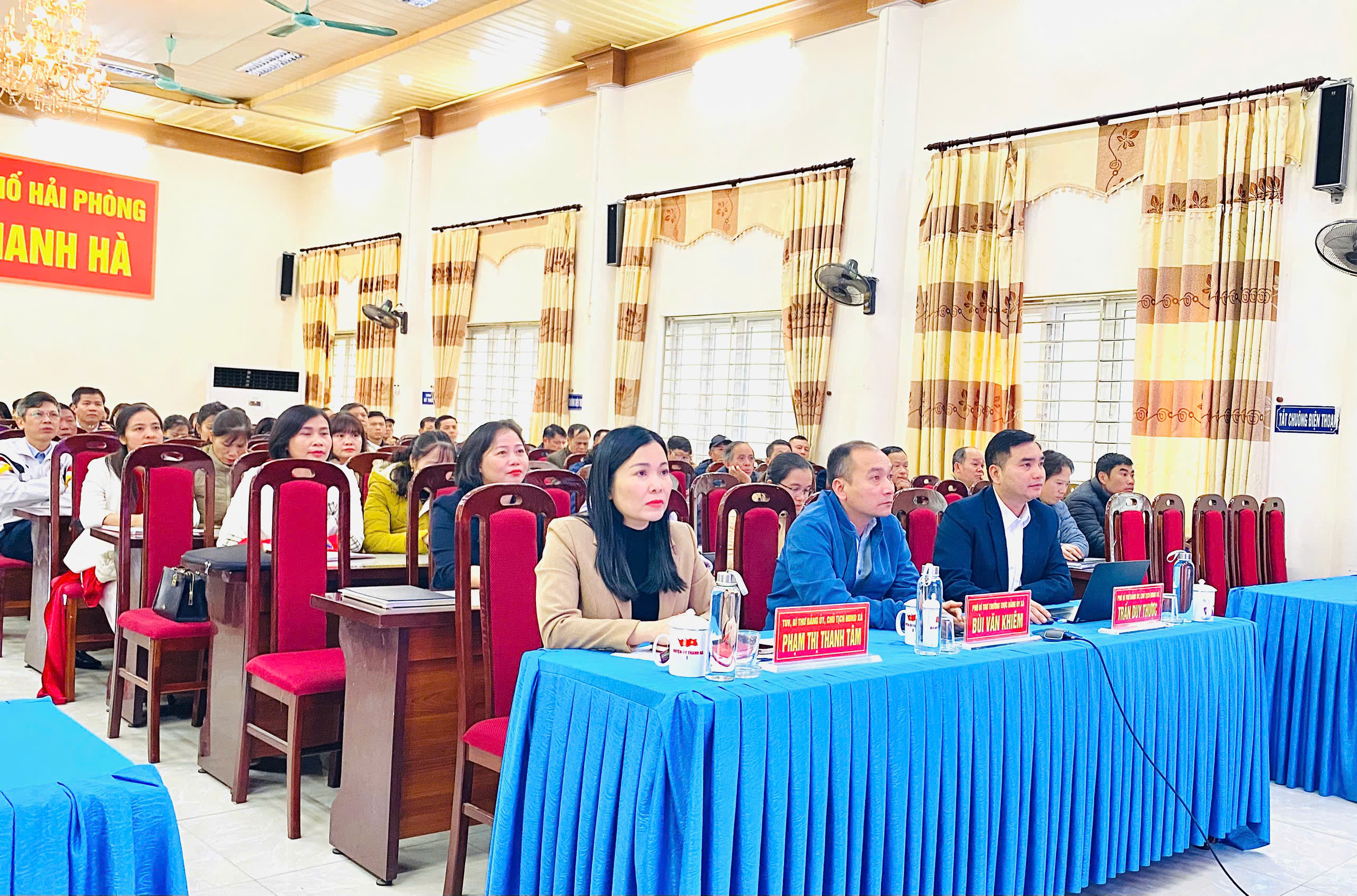 Dự hội nghị tại điểm cầu xã Thanh Hà có các đồng chí: Phạm Thị Thanh Tâm, Ủy viên Thành ủy, Bí thư Đảng ủy, Chủ tịch HĐND xã; Bùi Văn Khiêm, Phó Bí thư Thường trực Đảng ủy; Trần Duy Thược, Phó Bí thư Đảng ủy, Chủ tịch UBND xã.
