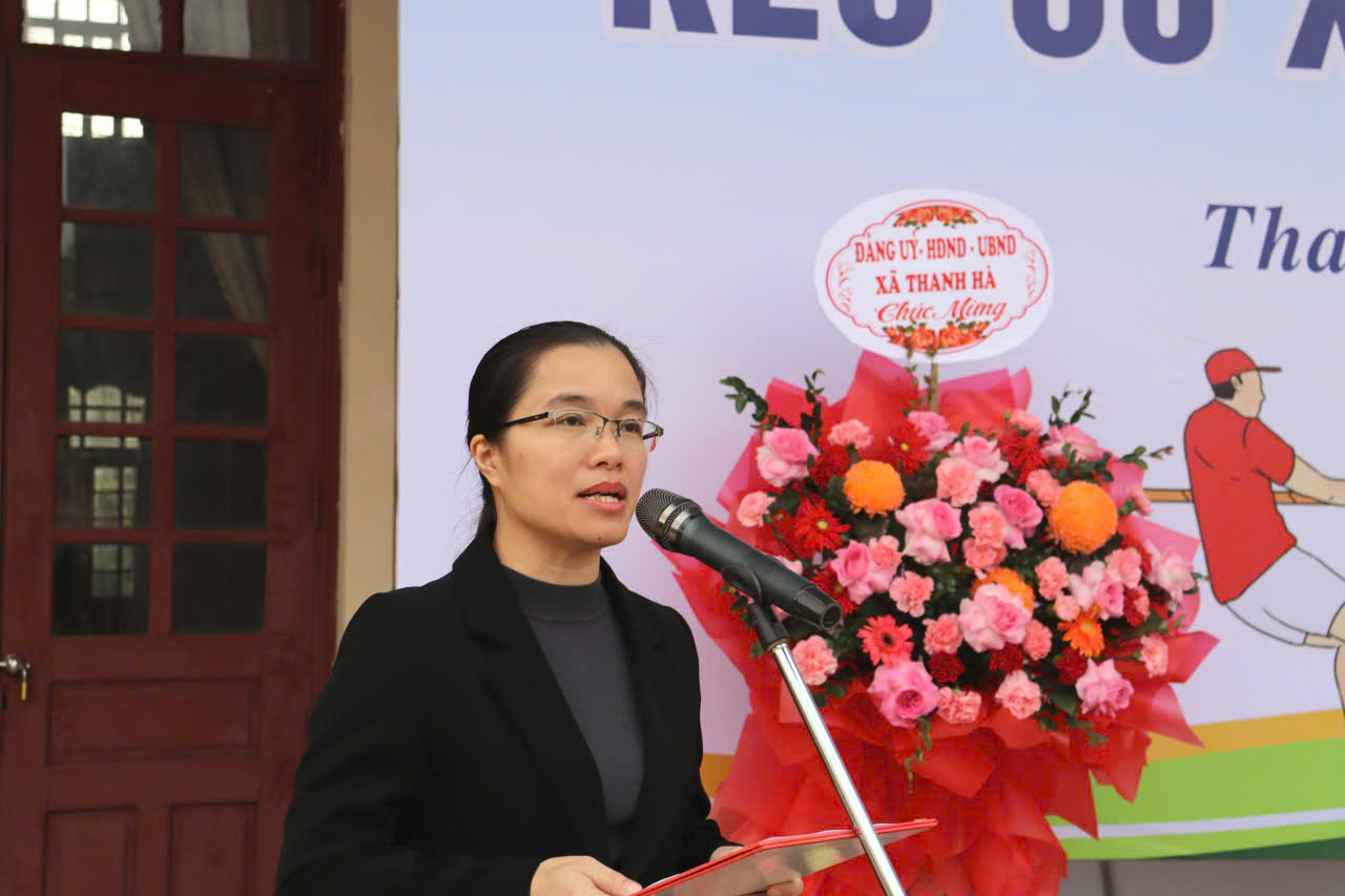 Đồng chí Nguyễn Thị Thúy, Phó Chủ tịch UBND xã, Trưởng Ban Tổ chức Đại hội Thể dục Thể thao xã phát biểu khai mạc giải đấu