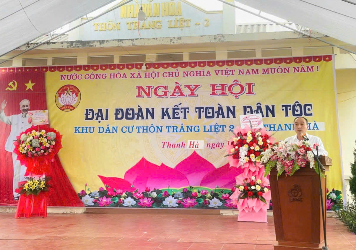 Phát biểu tại Ngày hội, đồng chí Bùi Văn Khiêm – Phó Bí thư Thường trực Đảng ủy xã ghi nhận và biểu dương những kết quả nổi bật mà thôn Tráng Liệt 2 đã đạt được trong thời gian qua. Đồng chí khẳng định Ngày hội Đại đoàn kết toàn dân tộc là dịp để nhân dân cùng nhìn lại chặng đường đoàn kết, gắn bó, xây dựng cộng đồng dân cư vững mạnh; đồng thời vui mừng trước những đổi thay tích cực của thôn, nhất là trong thực hiện Cuộc vận động “Toàn dân đoàn kết xây dựng nông thôn mới, đô thị văn minh”, trong xây dựng cơ sở hạ tầng, phát triển sản xuất và nâng cao đời sống của người dân.