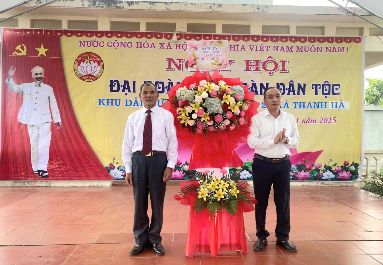 Đồng chí Bùi Văn Khiêm, Phó Bí thư Thường trực Đảng ủy xã thay mặt lãnh đạo Đảng ủy, HĐND, UBND, Ủy ban MTTQ Việt Nam xã tặng hoa chúc mừng thôn Tráng Liệt 2