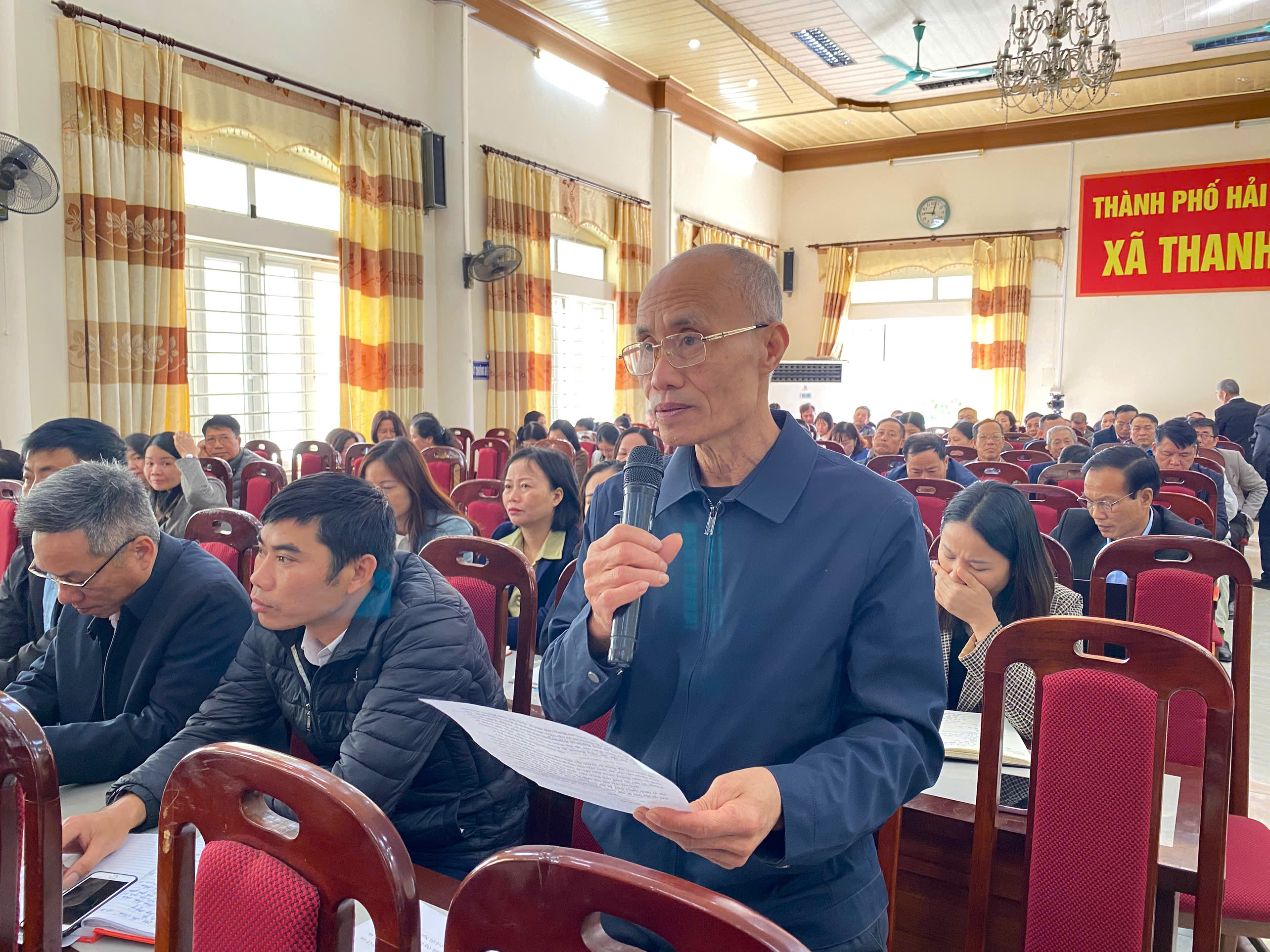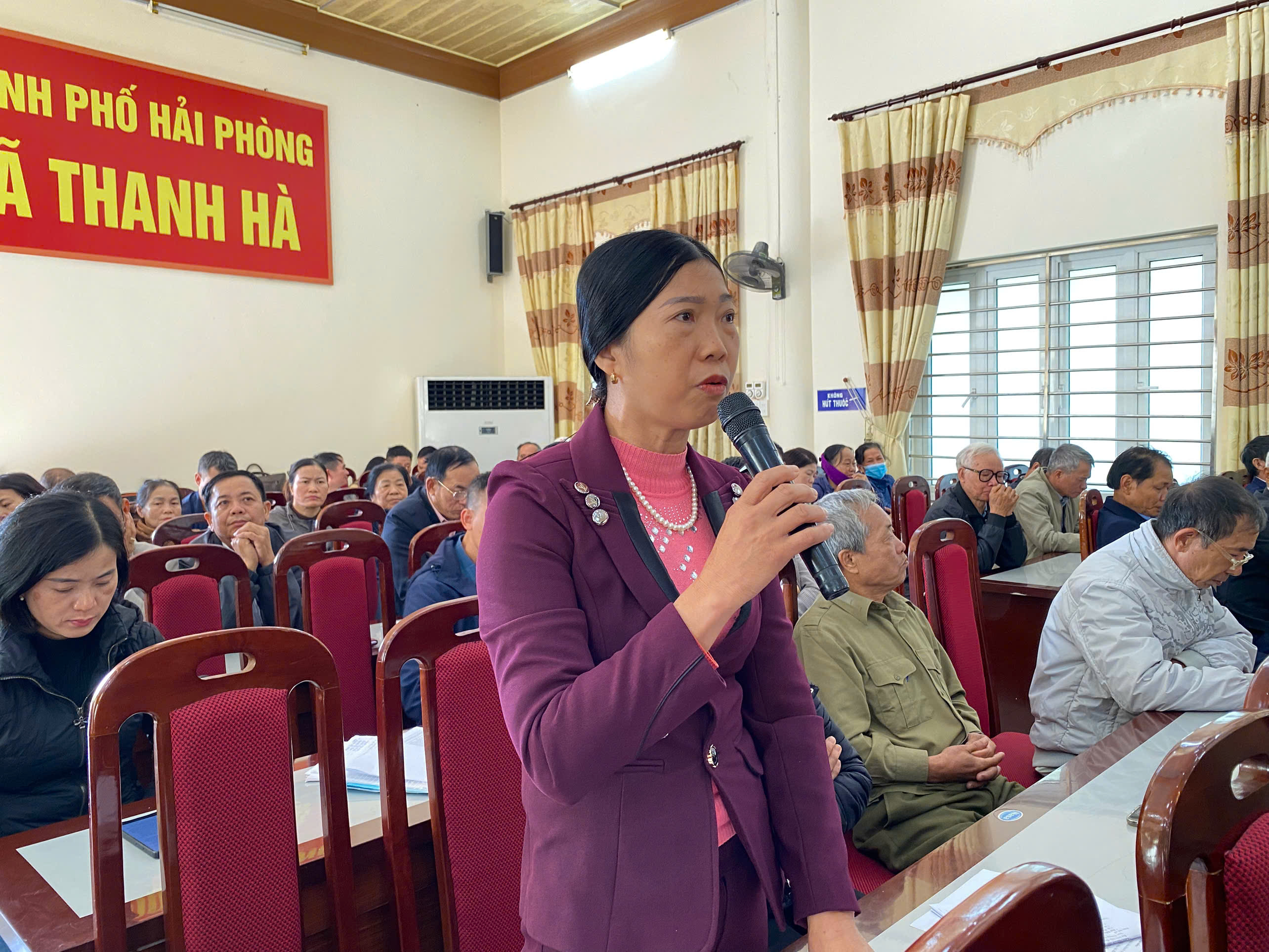 Cử tri cũng kiến nghị việc cấp giấy chứng nhận quyền sử dụng đất cho nhân dân còn chậm. Đề nghị quy hoạch mở rộng nghĩa trang nhân dân thôn Khánh Mậu xã Thanh Hà. Cần có sự chung tay vào cuộc đầu tư cơ sở hạ tầng cho du lịch sinh thái, du lịch trải nghiệm và nhân rộng các mô hình này để thu hút khách đến thăm quan, nâng cao thu nhập cho người dân. Đề nghị UBND thành phố Hải Phòng sớm chi tiền hỗ trợ người có công làm nhà ở; đề nghị có biện pháp cứng rắn, răn đe với các trường hợp cố tình trốn tránh việc thực hiện NVQS…