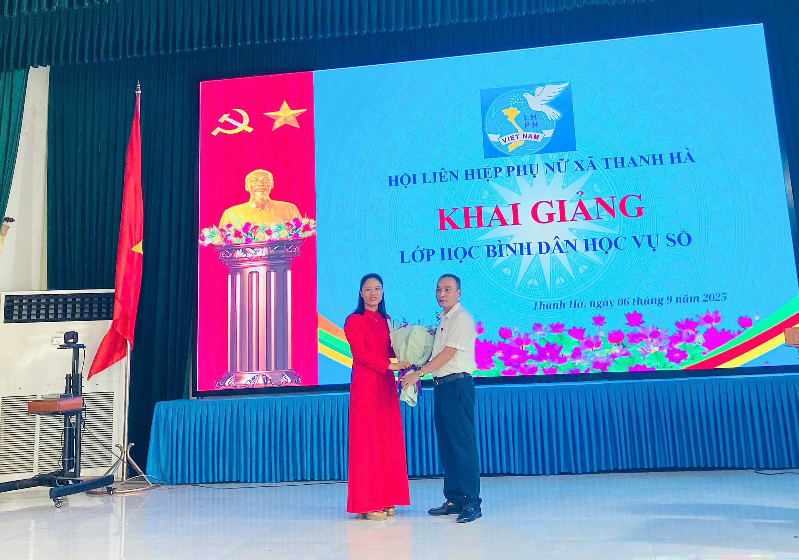 Đồng chí Bùi Văn Khiêm, Phó Bí thư Thường trực Đảng ủy xã tặng hoa chúc mừng lớp học