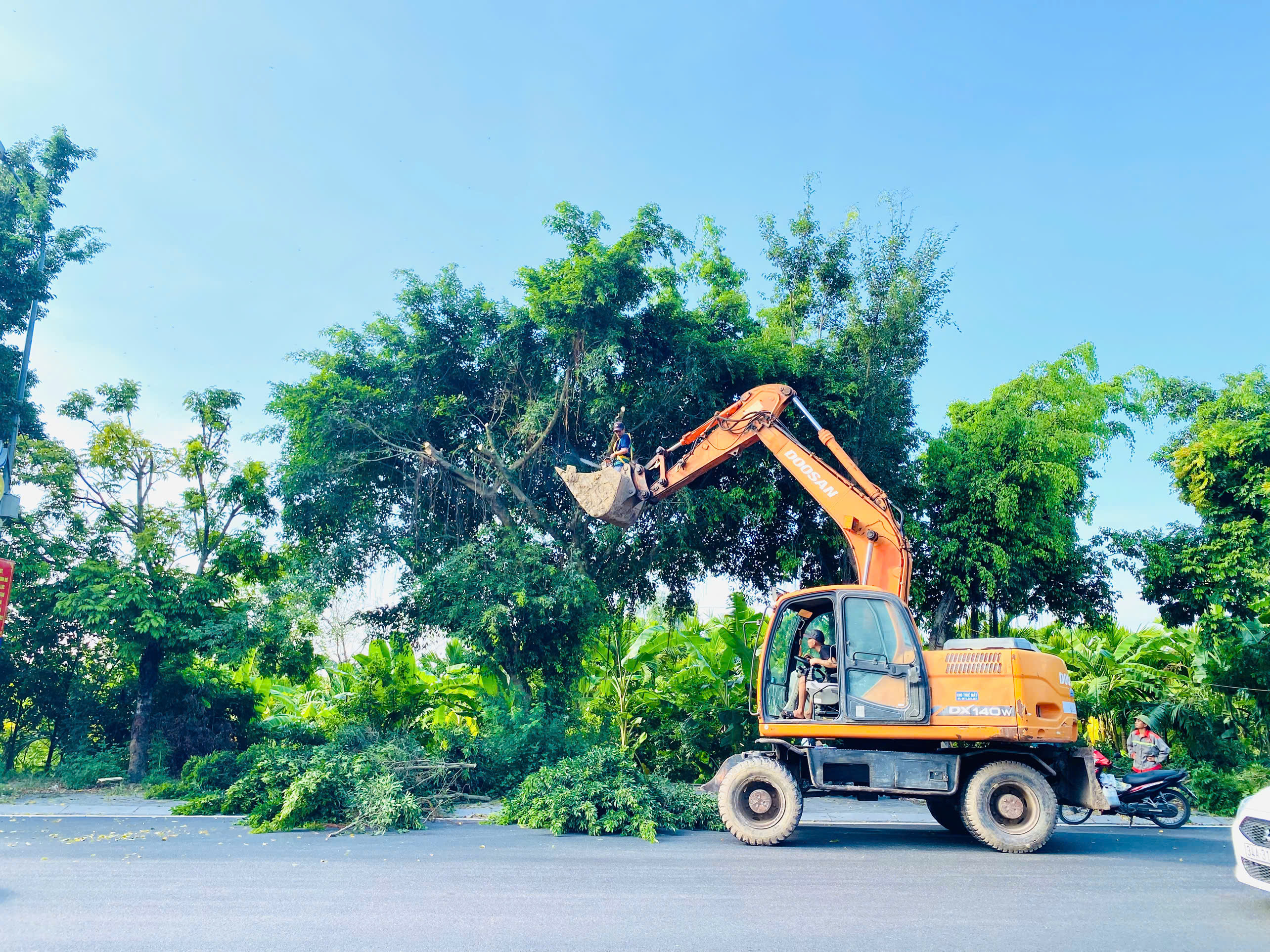 Phòng kinh tế xã huy động các phương tiện chuyên dụng tham gia cắt tỉa cây xanh trên các tuyến đường