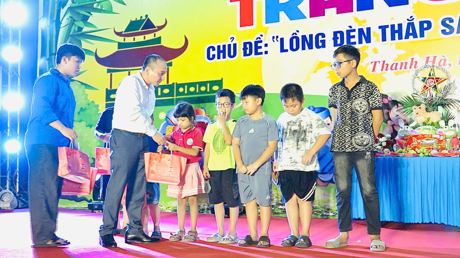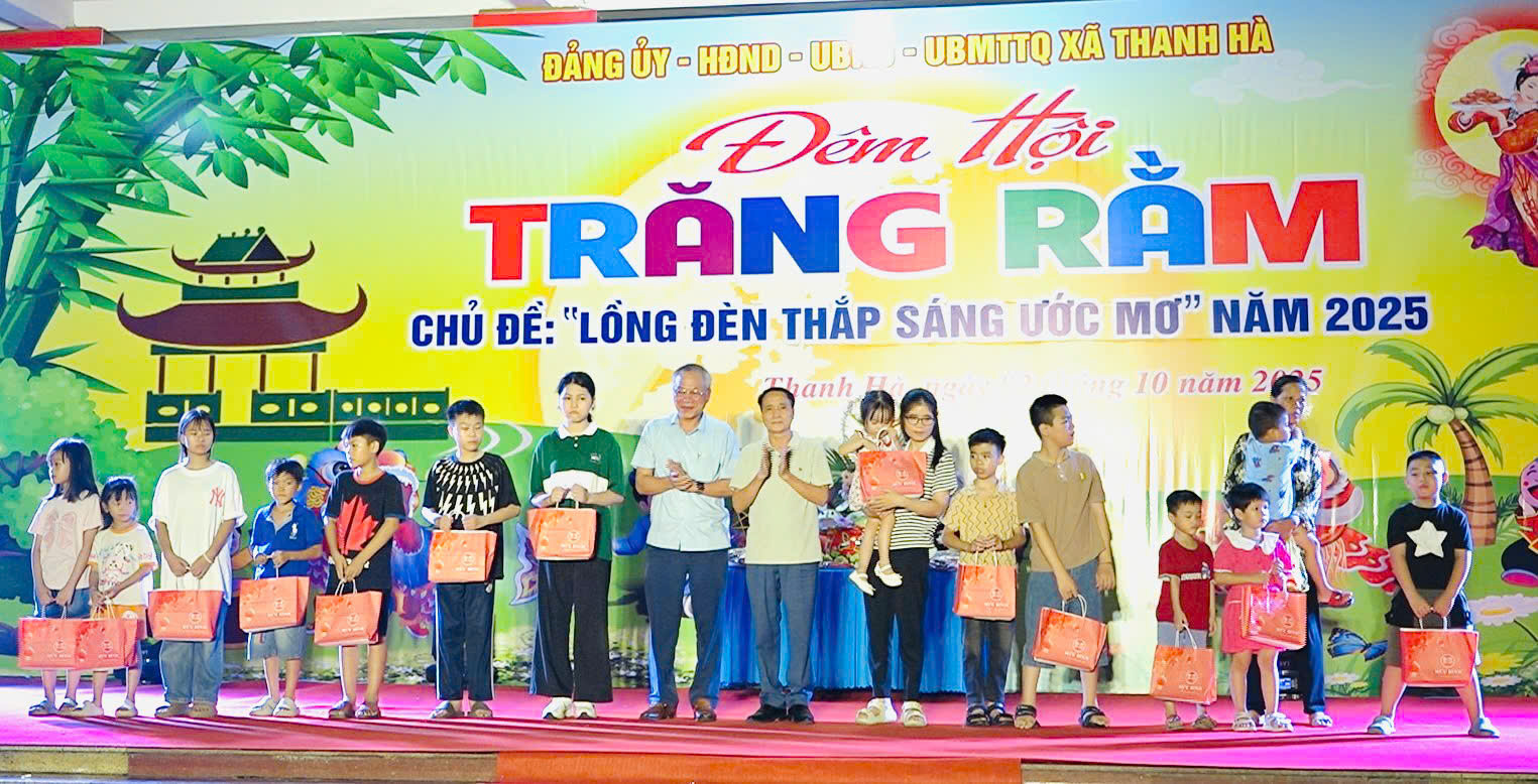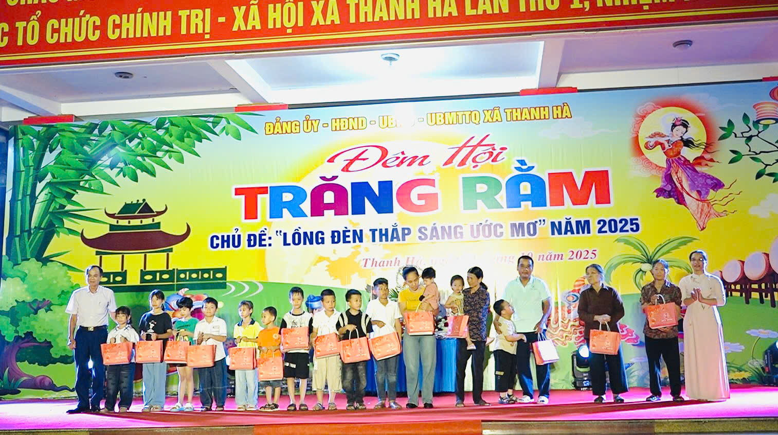 Tại “Đêm hội Trăng rằm”, xã Thanh Hà và các nhà tài trợ đã trao tổng số 80 suất quà cho các em thiếu niên, nhi đồng có hoàn cảnh đặc biệt khó khăn trong xã. Trong đó, Trung tâm Công tác xã hội và bảo trợ trẻ em Hoa Phượng tặng 10 suất quà, gồm 5 suất mỗi suất trị giá 1.000.000đ và 5 suất mỗi suất trị giá 500.000đ; địa phương và các nhà tài trợ trao 70 suất quà, mỗi suất gồm quà và 300 nghìn đồng tiền mặt. Tiêu biểu như Ngân hàng Agibank Thanh Hà, Bà Nguyễn Thị Quế - Giám đốc tài chính Công ty nhôm Đông Á; Quỹ tín dụng nhân dân Thanh Xá, Thanh Thủy…